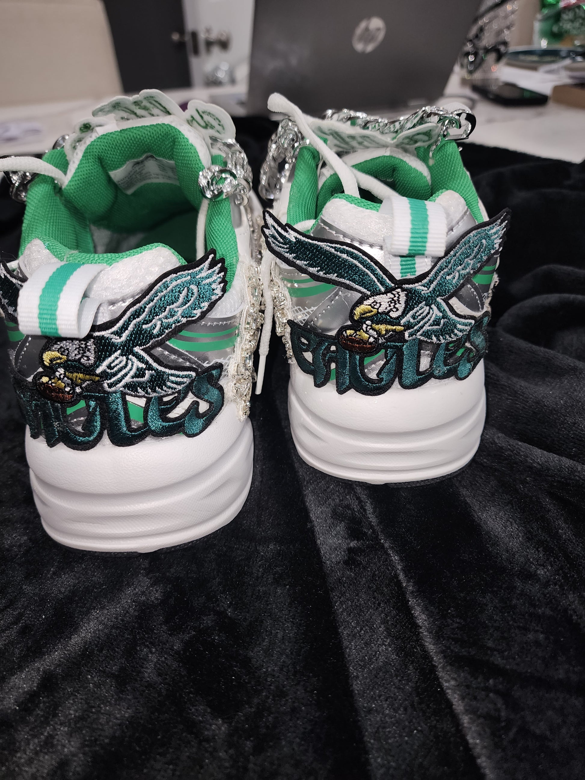 Fly high in these one-of-a-kind Philadelphia Eagles sneakers, customized with dazzling bling that catches every eye. Size 9.5, these are the last pair available—